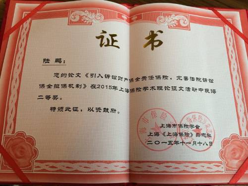 2015年11月19日上午,上海市保险学会2015年学术年会在中国金融信息中心盛大召开,本次会议主题为“保险创新与上海国际保险中心建设”。会上,对2015年上海保险学术理论征文活动进行了颁奖,我司陆鹏撰写的《引入诉讼财产保全责任保险,完善法院诉讼保全担保机制》荣获二等奖。