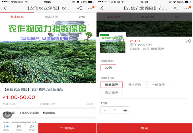 Step2:点击立即购买,选择保障期限和保障方案。保障方案分为四档:最低保障(1元保费)、基本保障(5元保费)、一般保障(10元保费)、高级保障(50元保费)。无须选择数量直接点击确定。