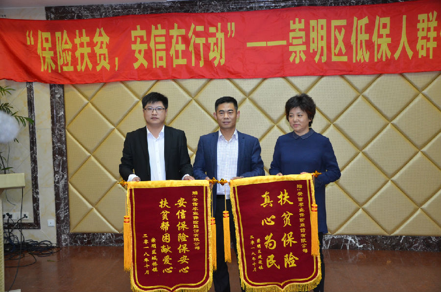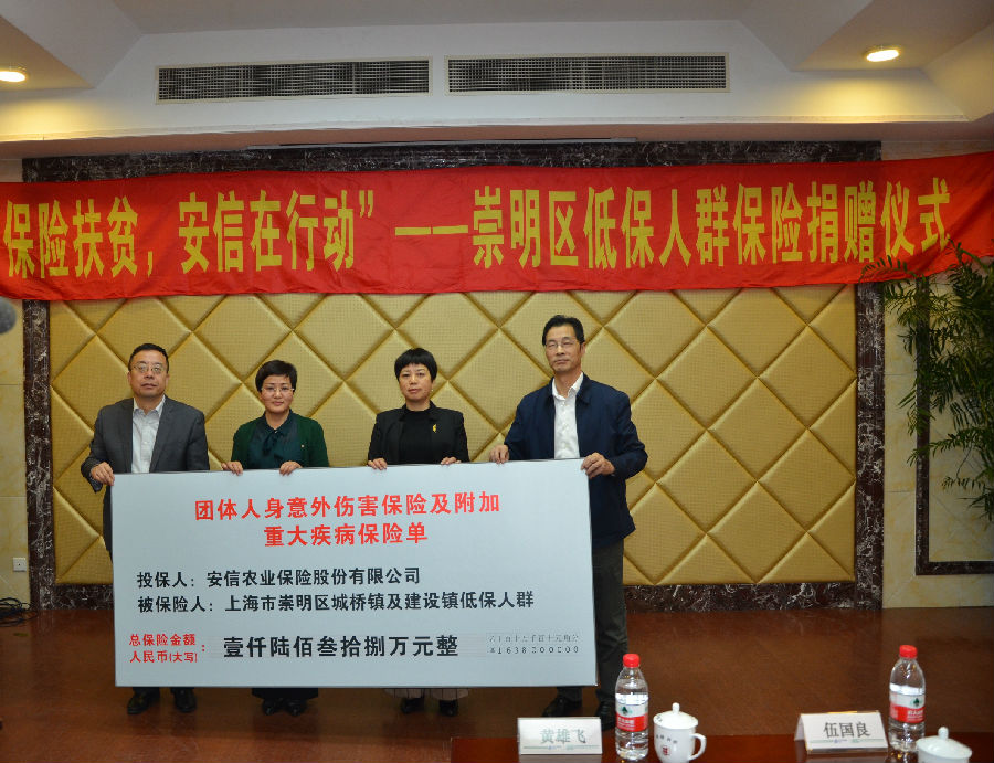 10月16日下午,“7.8保险扶贫,安信在行动” 低保人群保险捐赠活动在上海市崇明区城桥镇圆满举行。安信农业保险公司向崇明区城桥镇和建设镇546名低保人员捐赠了团体人身意外伤害保险以及附加重大疾病保险,总保险金额共计1638万元,保险期限一年。保险内容为:团体人身意外伤害保险,保险金额25000元/人;附加重大疾病保险,保险金额5000元/人。本次活动得到了上海市保险同业公会的大力支持和指导。上海市保险同业公会副秘书长伍国良,安信农业保险股份有限公司副总裁黄雄飞,崇明区民政局副局长马永峰等领导出席了此次捐赠活动。